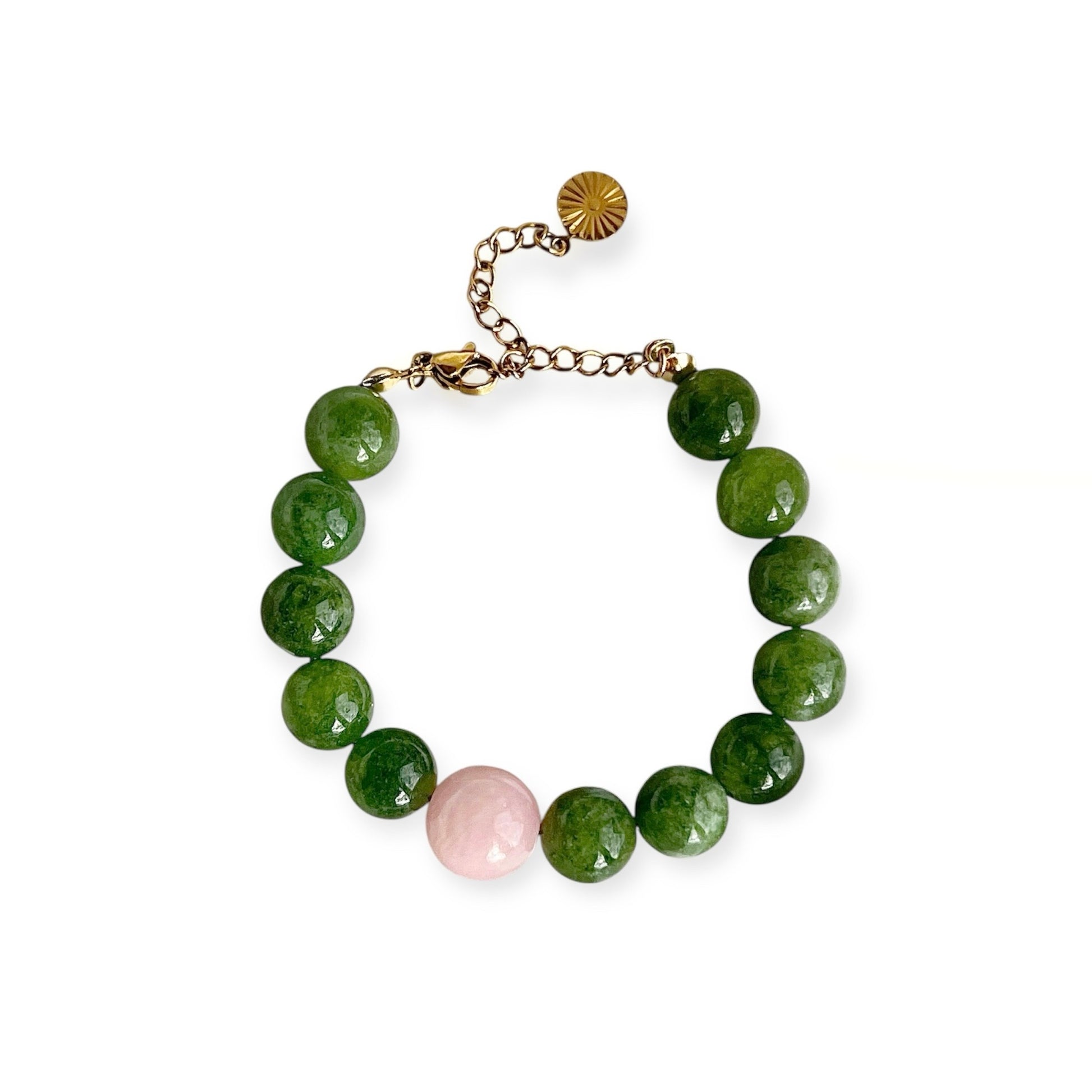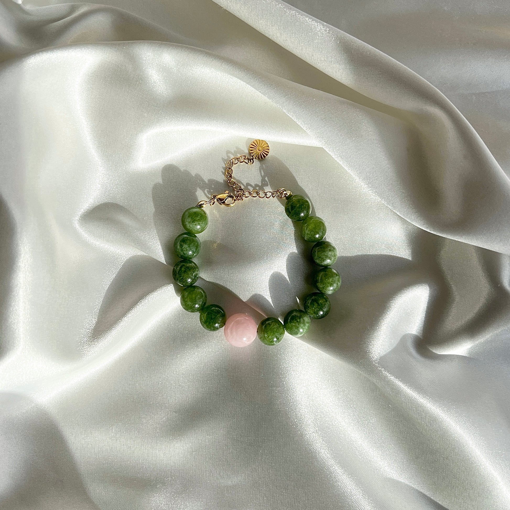 Smukt armbånd med grønne jade perler og en enkelt lyserød.