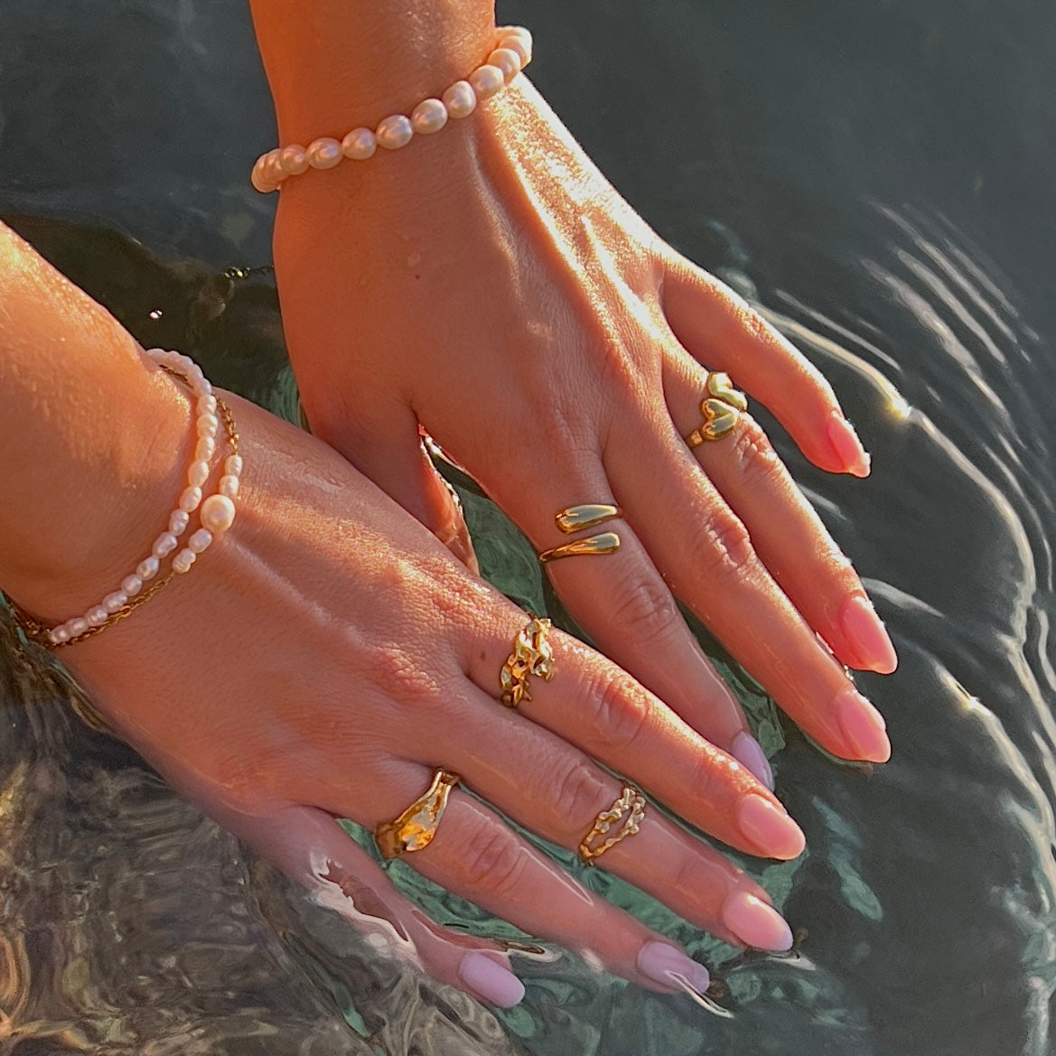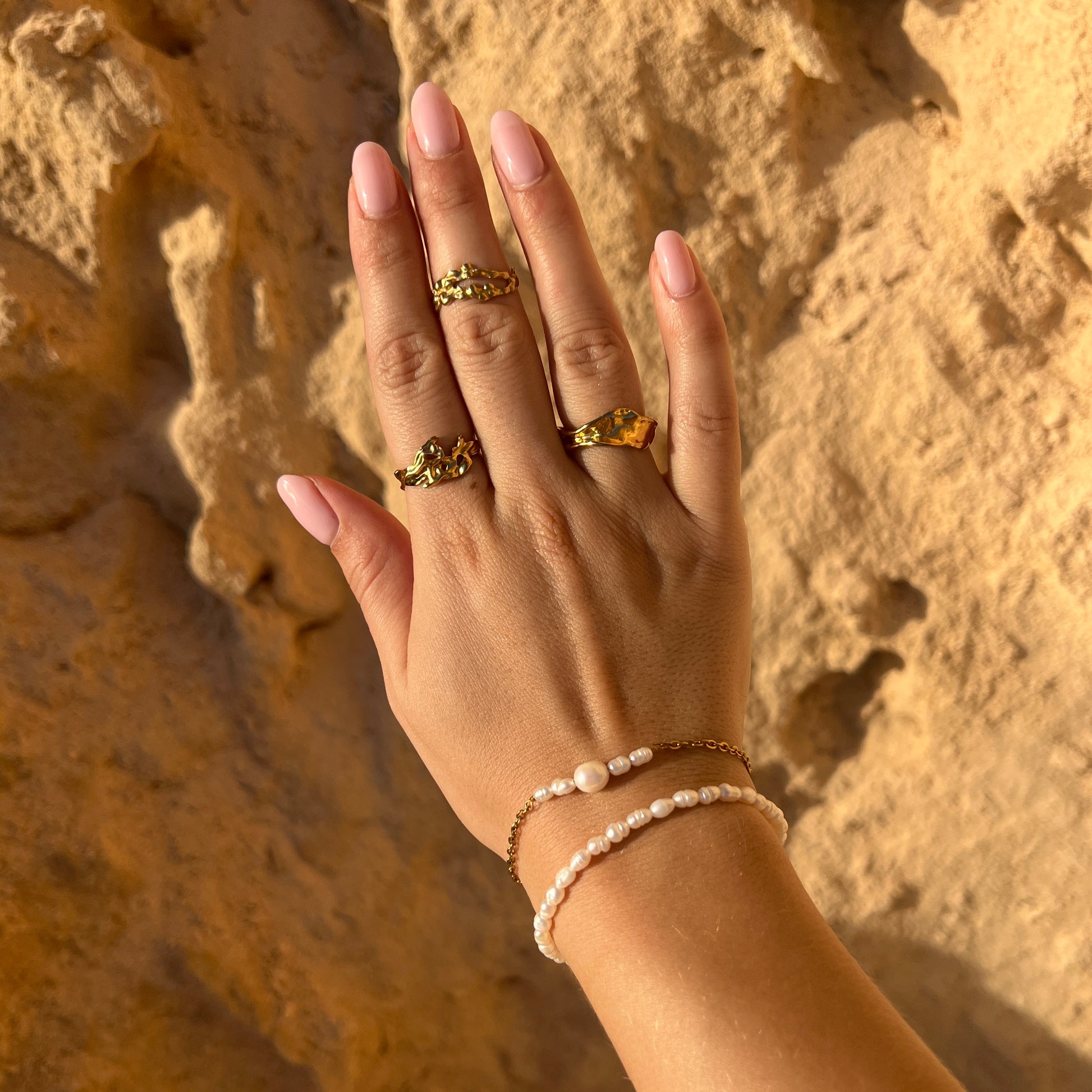 Armbånd med små, ægte ferskvandsperler, der hver især har en unik, naturlig form.