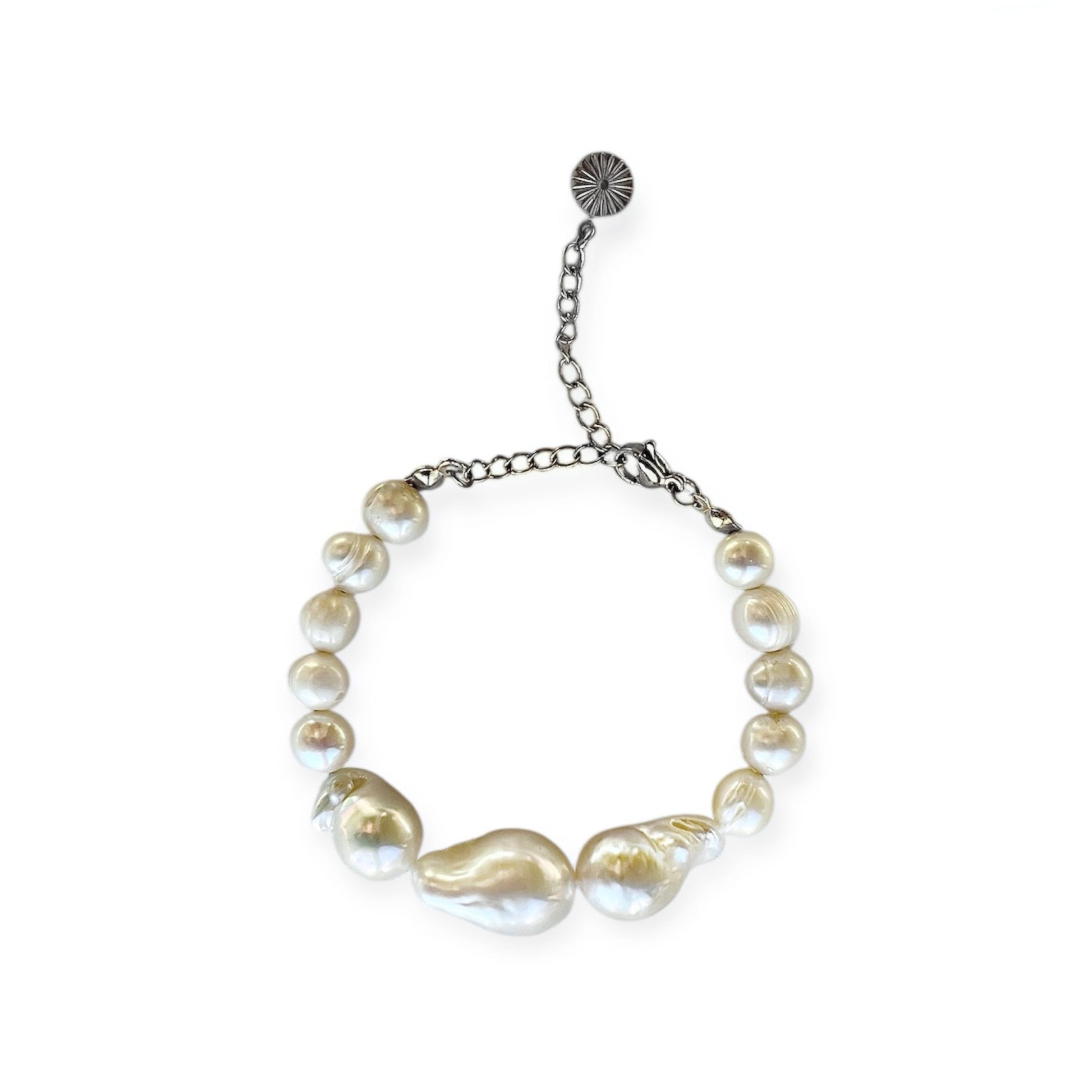 Et elegant armbånd med ægte barok ferskvandsperler i smukke, organiske former kombineret med mindre, runde fersvandsperler, der tilsammen skaber et eksklusivt og moderne udtryk.