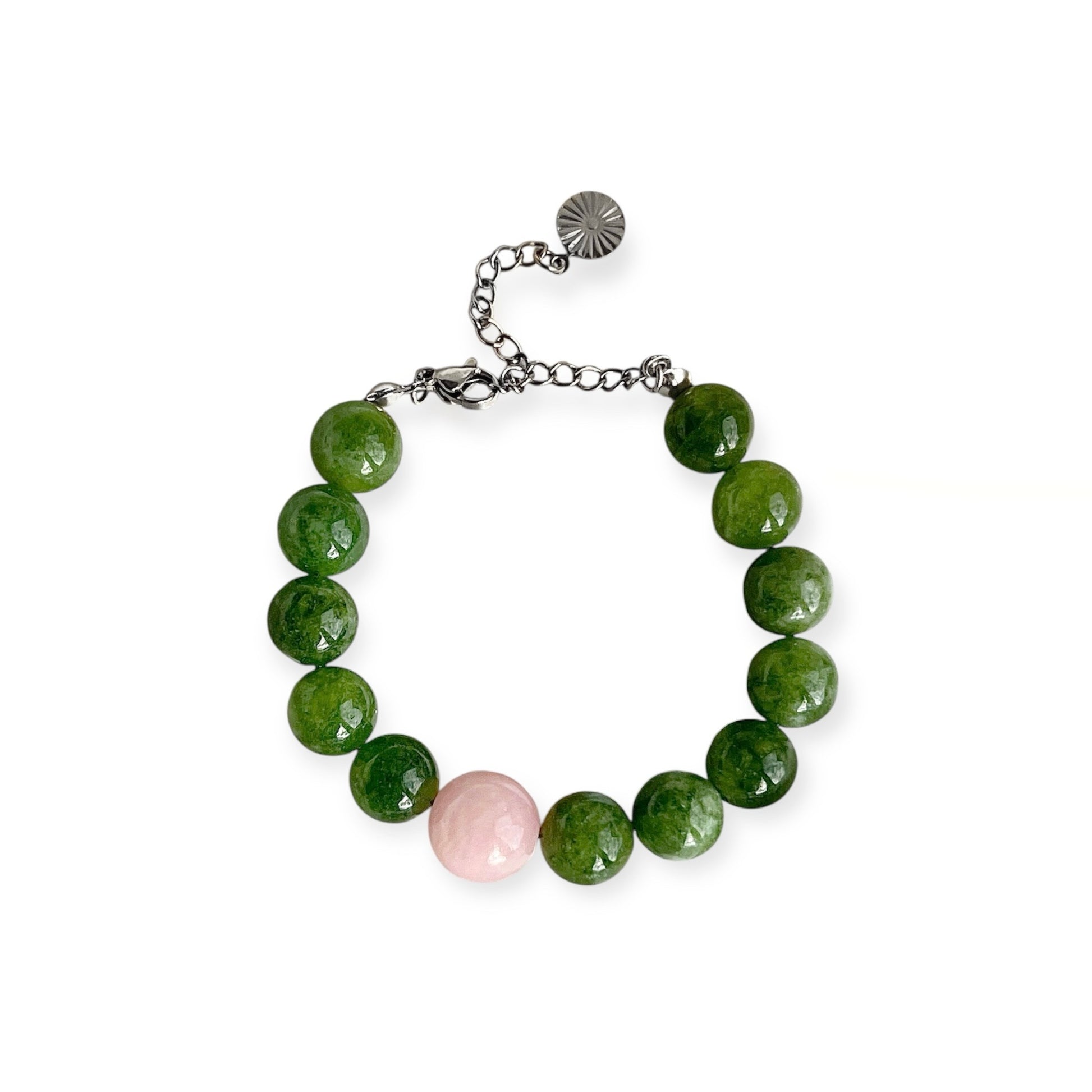 Smukt armbånd med grønne jade perler og en enkelt lyserød.