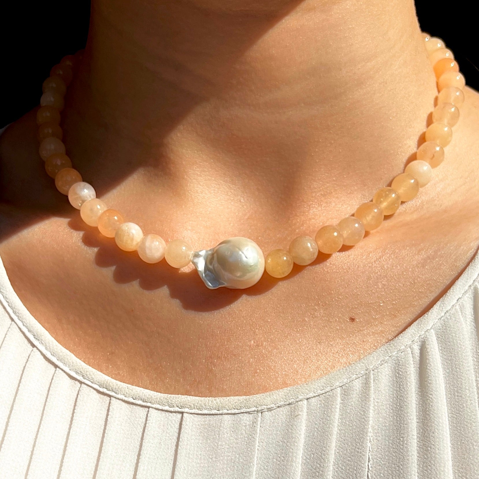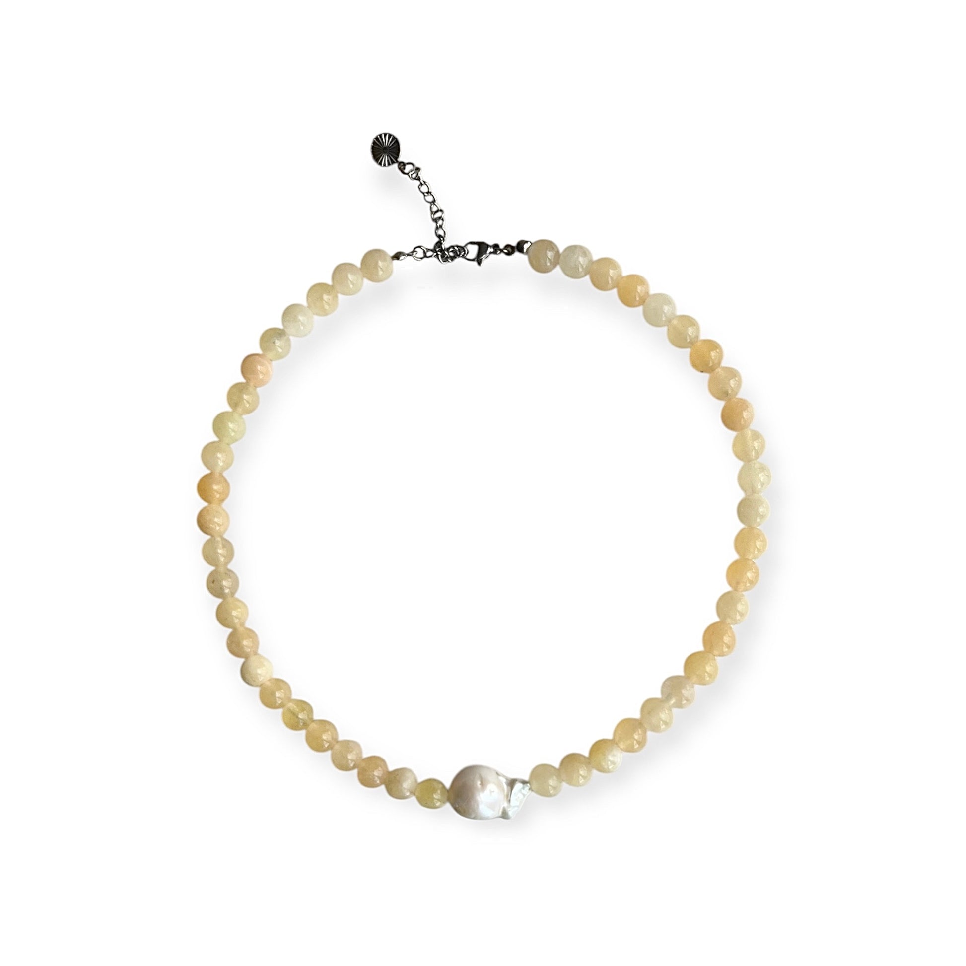 Smuk halskæde med stor, ægte barok ferskvandsperle og 8mm gule jade perler.