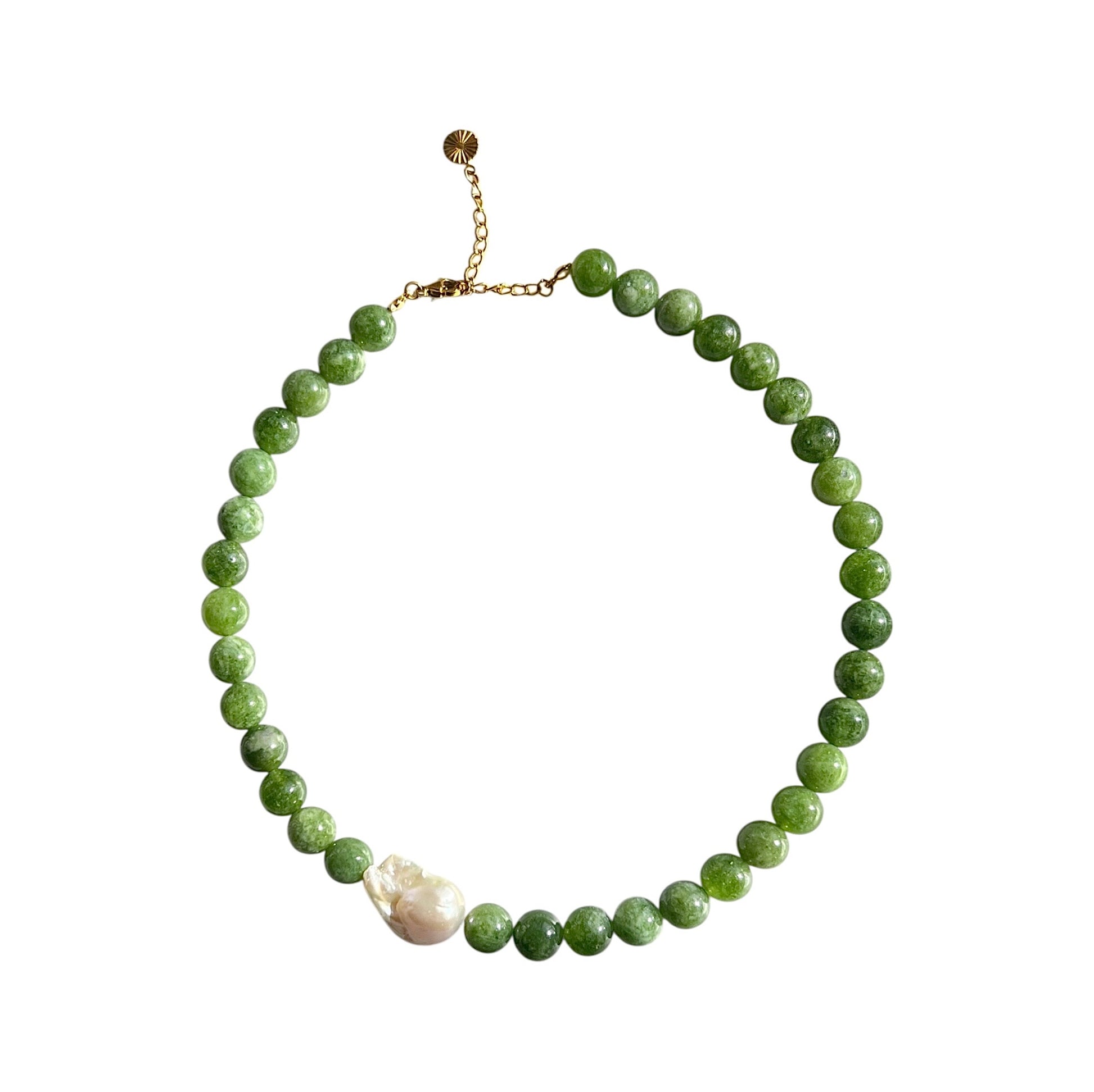 Smuk halskæde med 10 mm mørkegrønne jade perler og en stor barokferskvandsperle.
