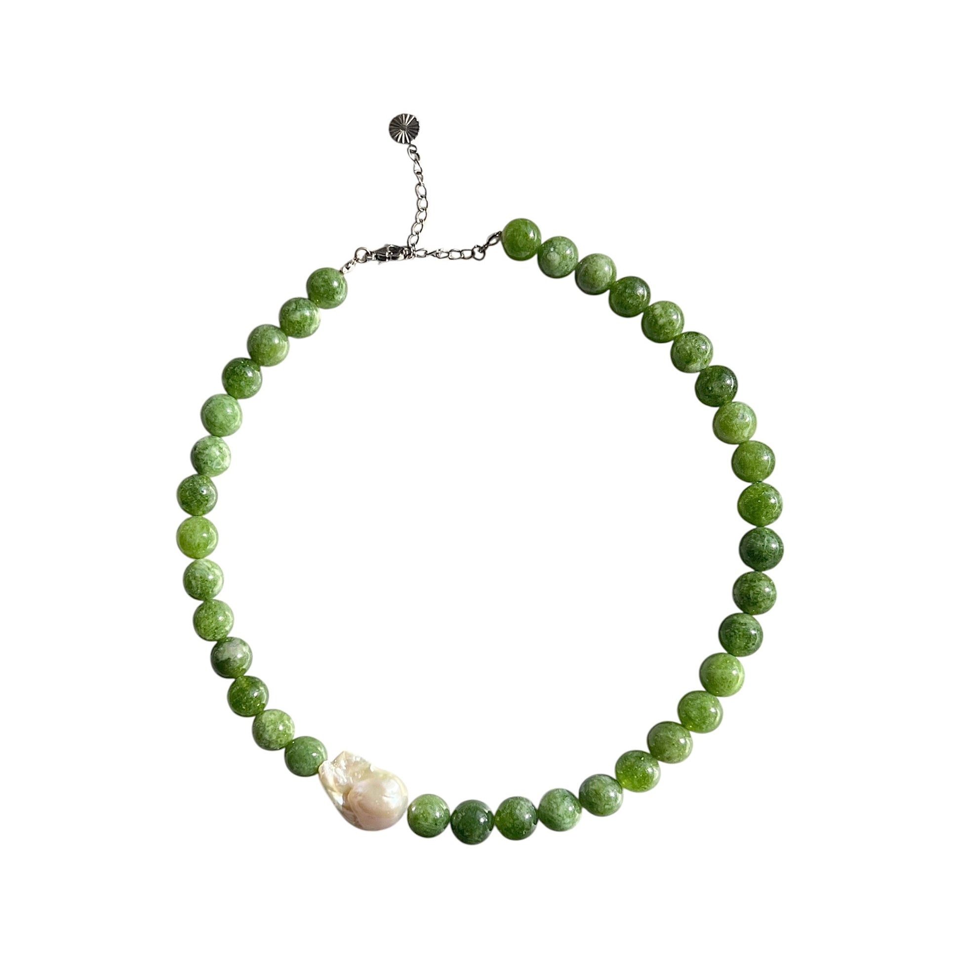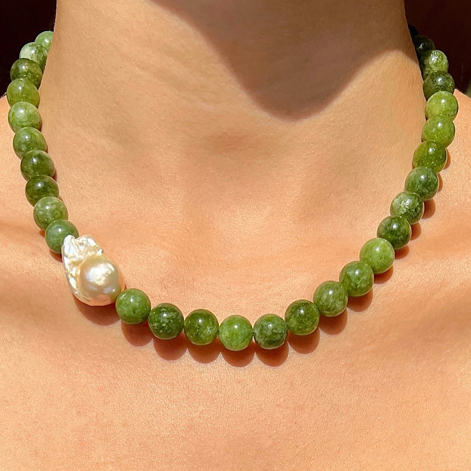 Smuk halskæde med 10 mm mørkegrønne jade perler og en stor barok ferskvandsperle.