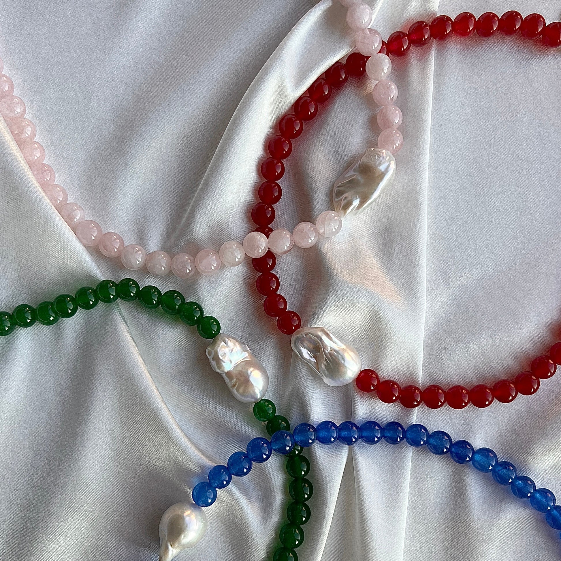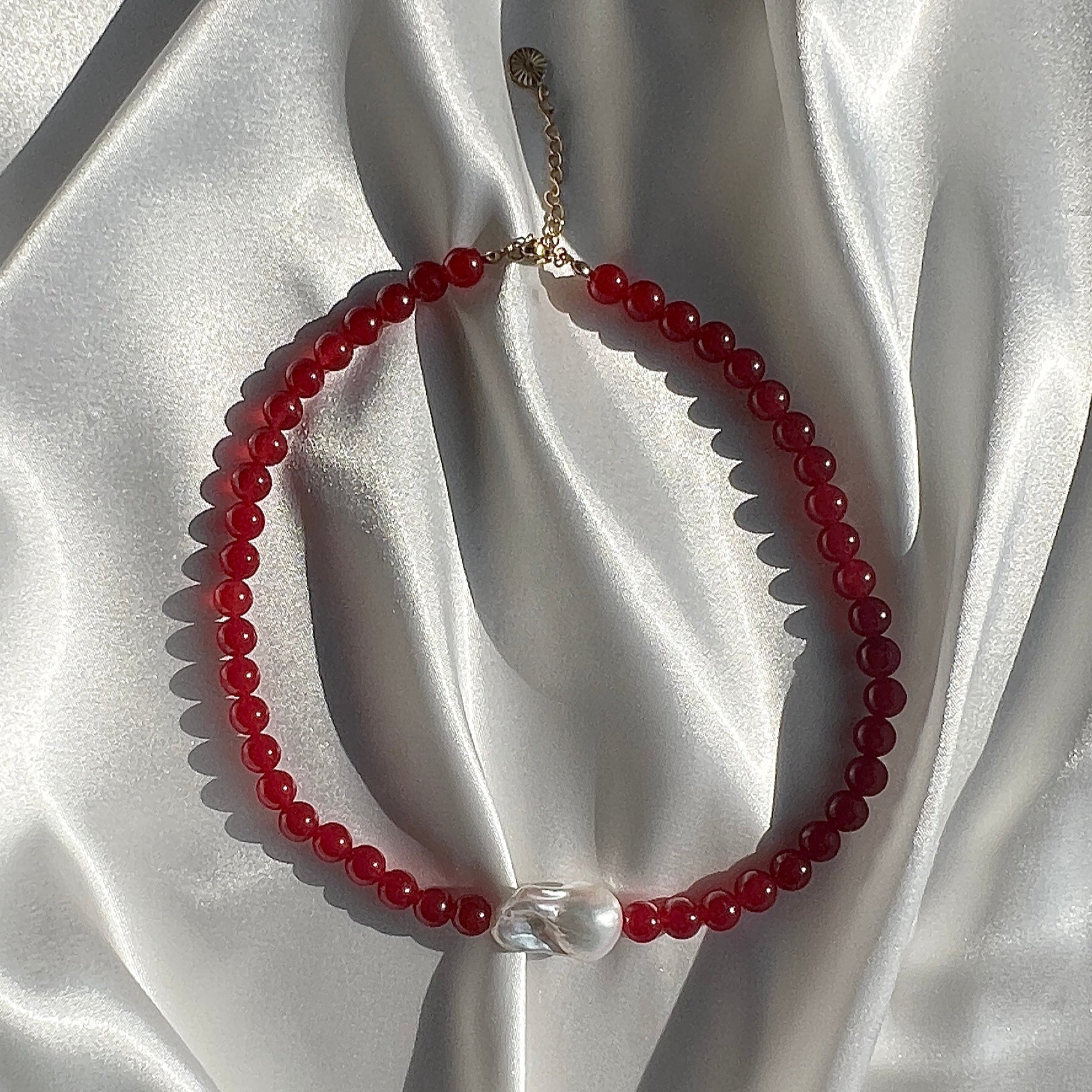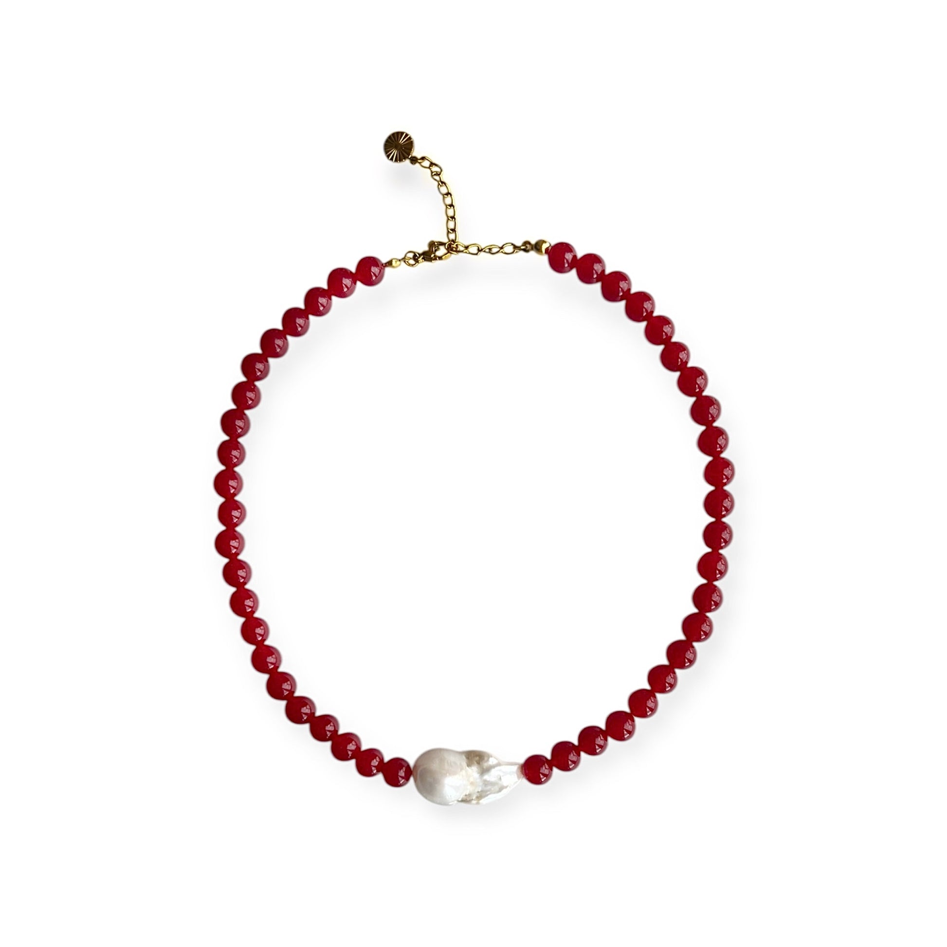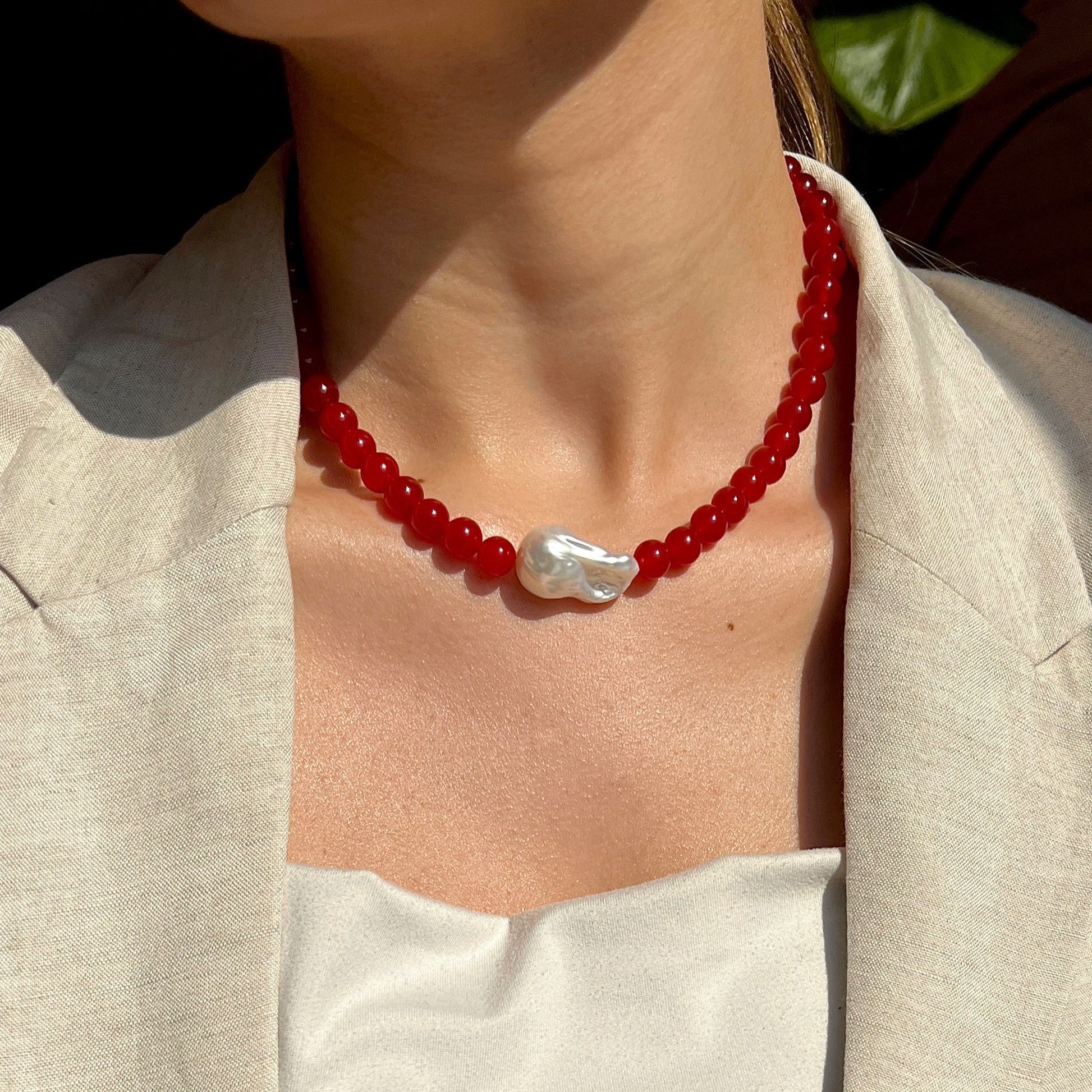Smuk halskæde med stor, ægte barok ferskvandsperle og 8mm røde jade perler.