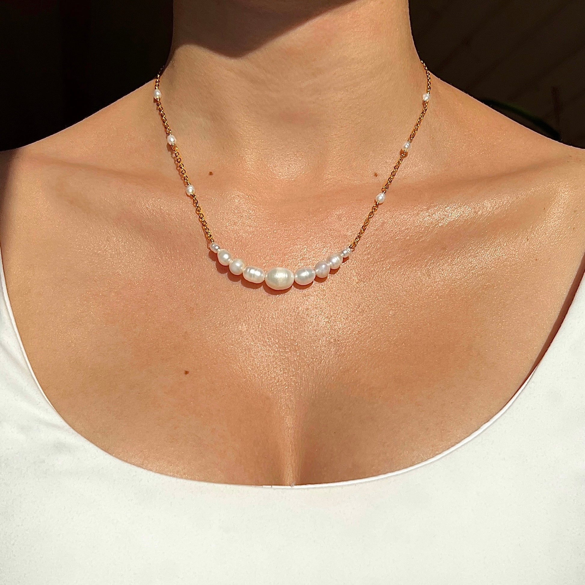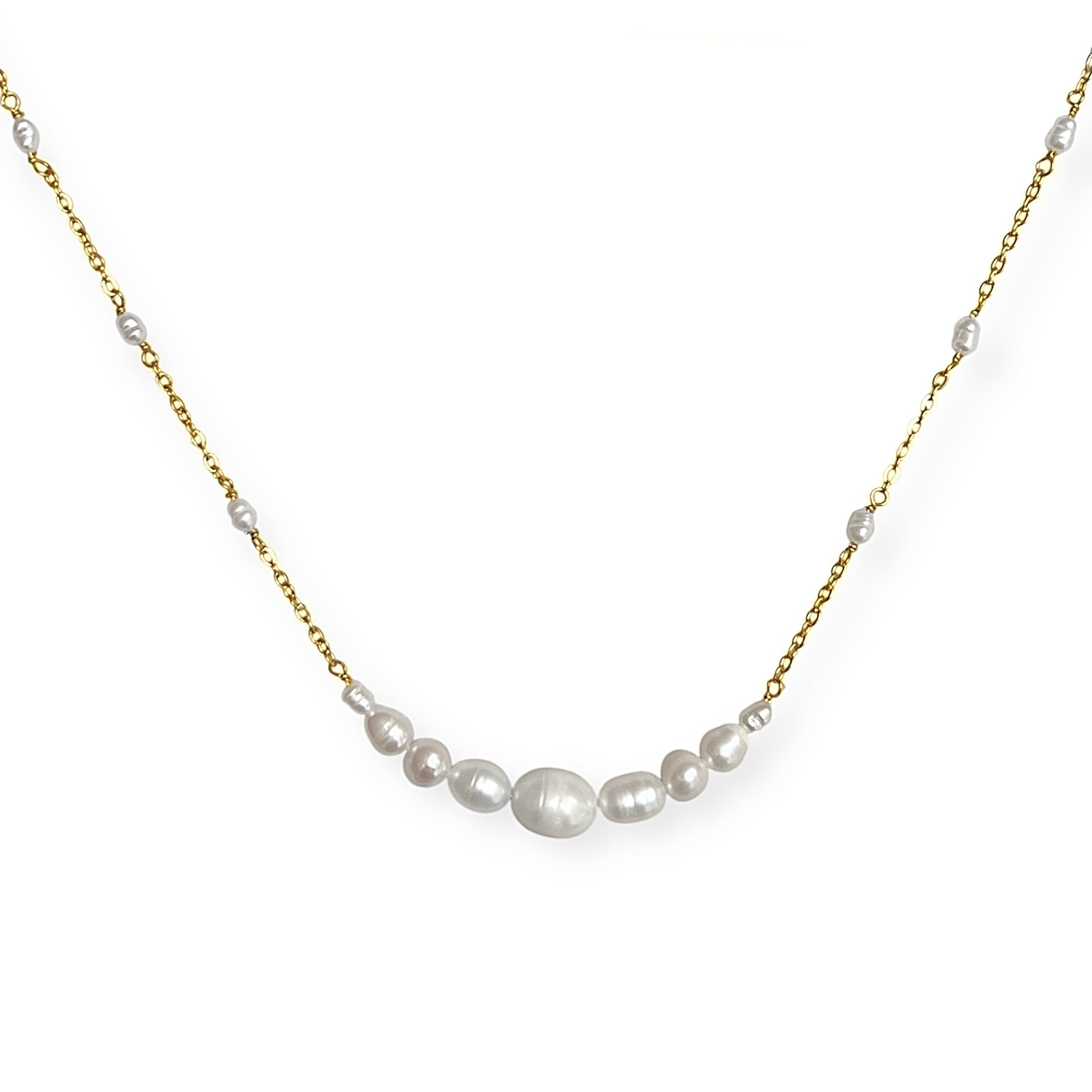 De smukke, ægte ferskvandsperler varierer i størrelse og form, hvilket giver smykket et unikt og organisk udtryk.