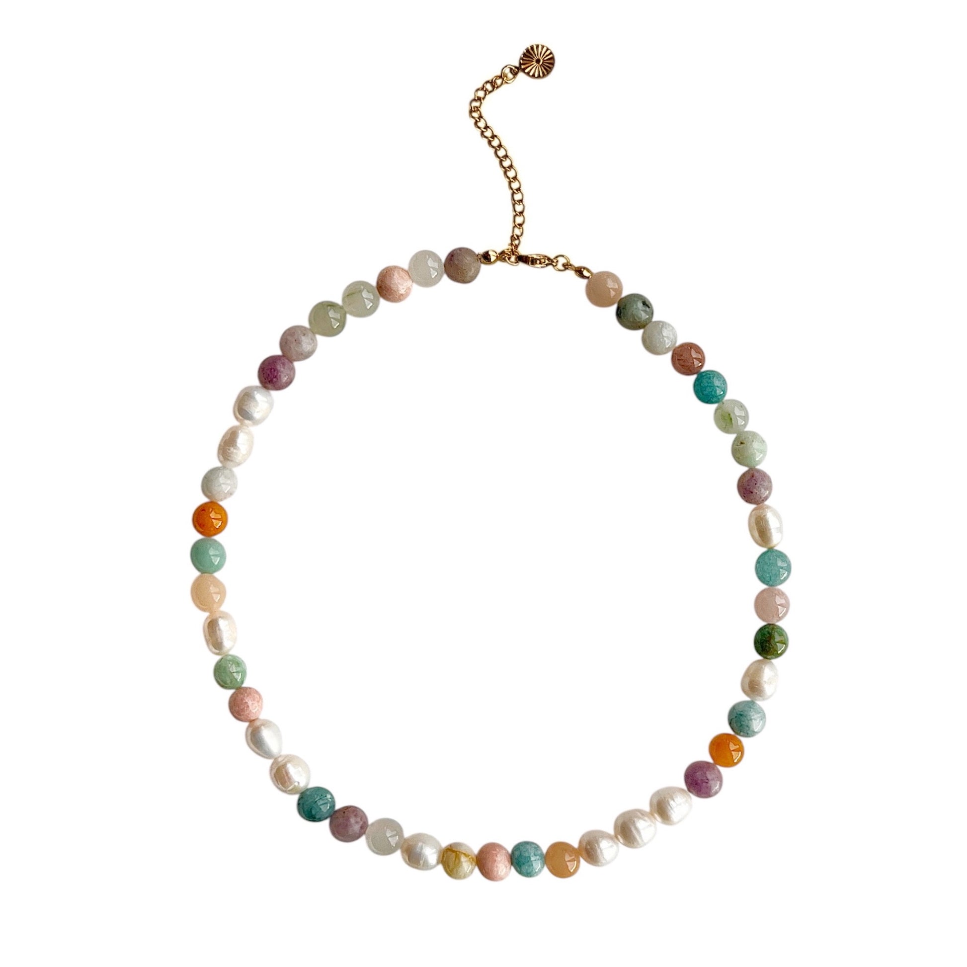 Smuk halskæde med 8 mm stenperler i forskellige, smukke farver og ægte ferskvandsperler.