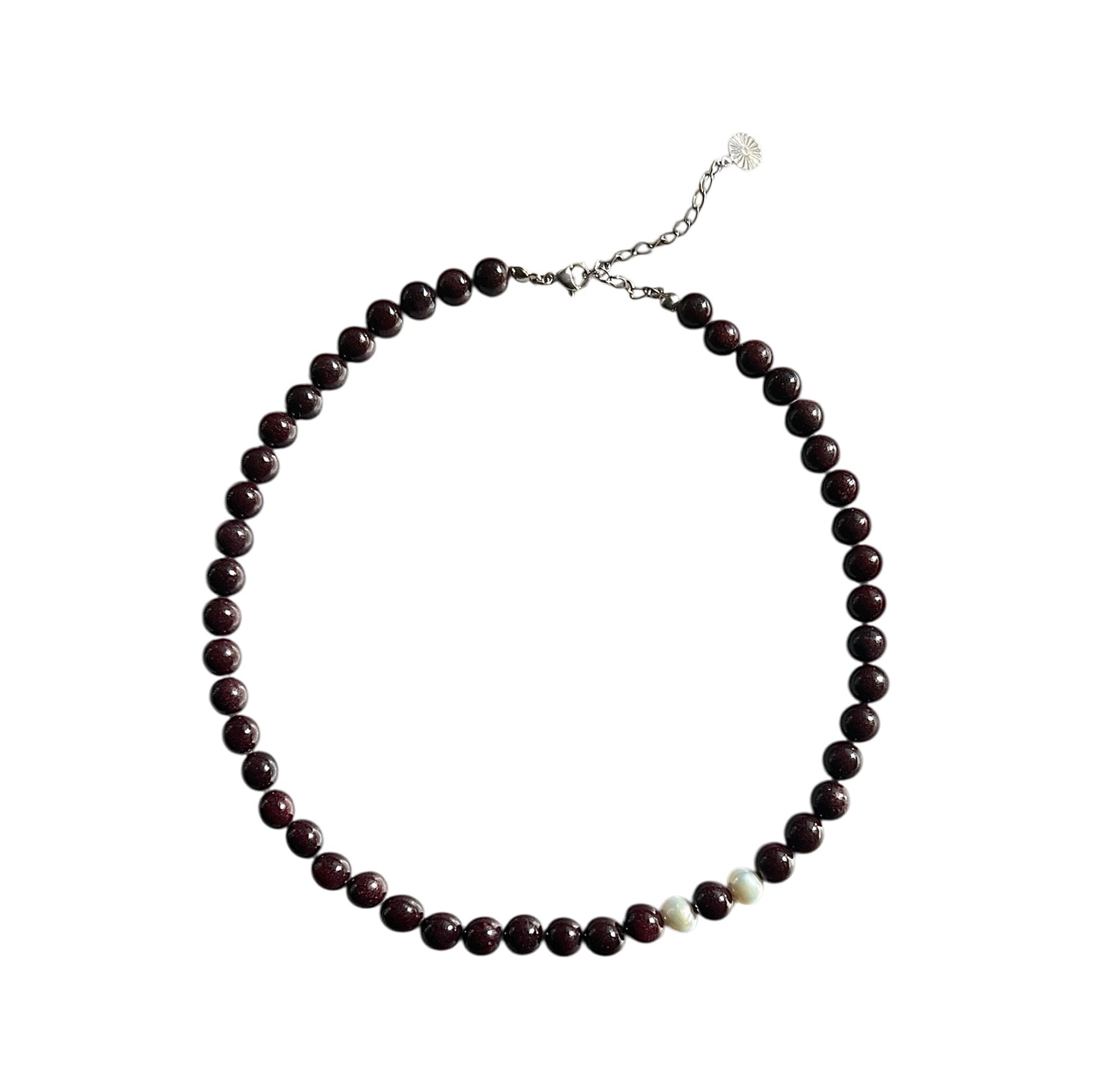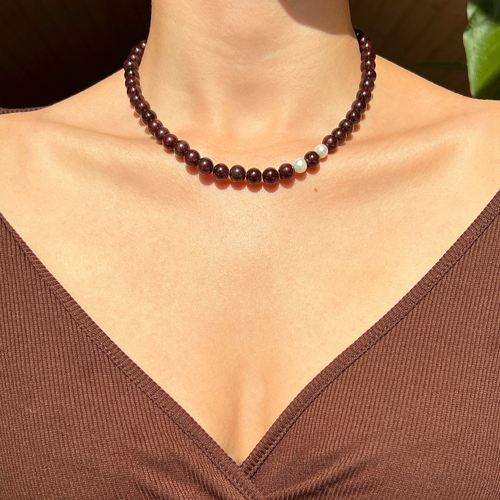 Smuk halskæde med 8 mm mørkebrune granatstensperler og to hvide ferskvandsperler.