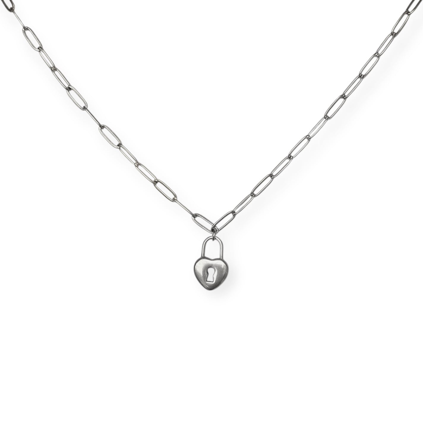 Smuk halskæde med paper clip kæde og hjerteformet hængelås som vedhæng.