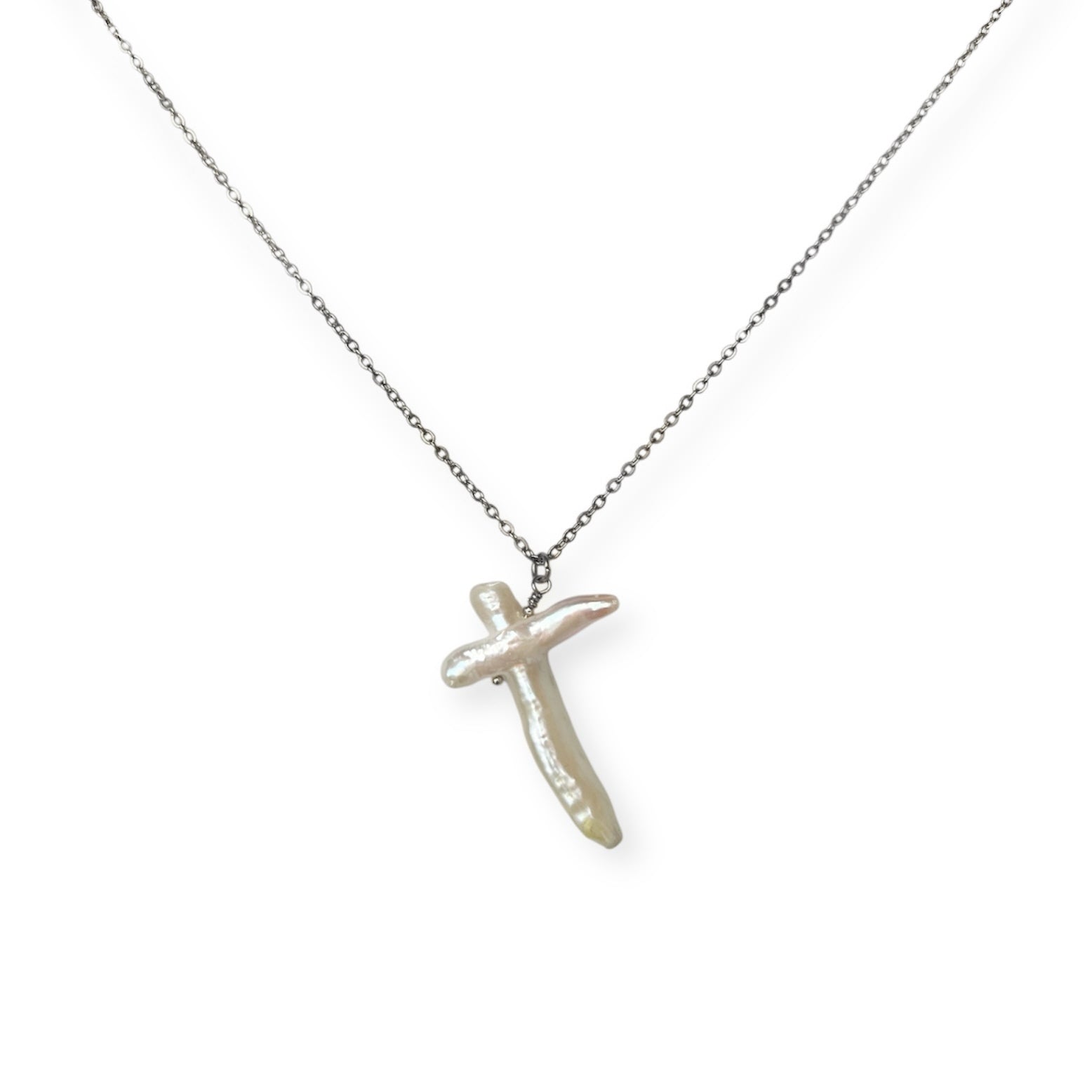 Halskæde med korsformet ferskvandsperle.