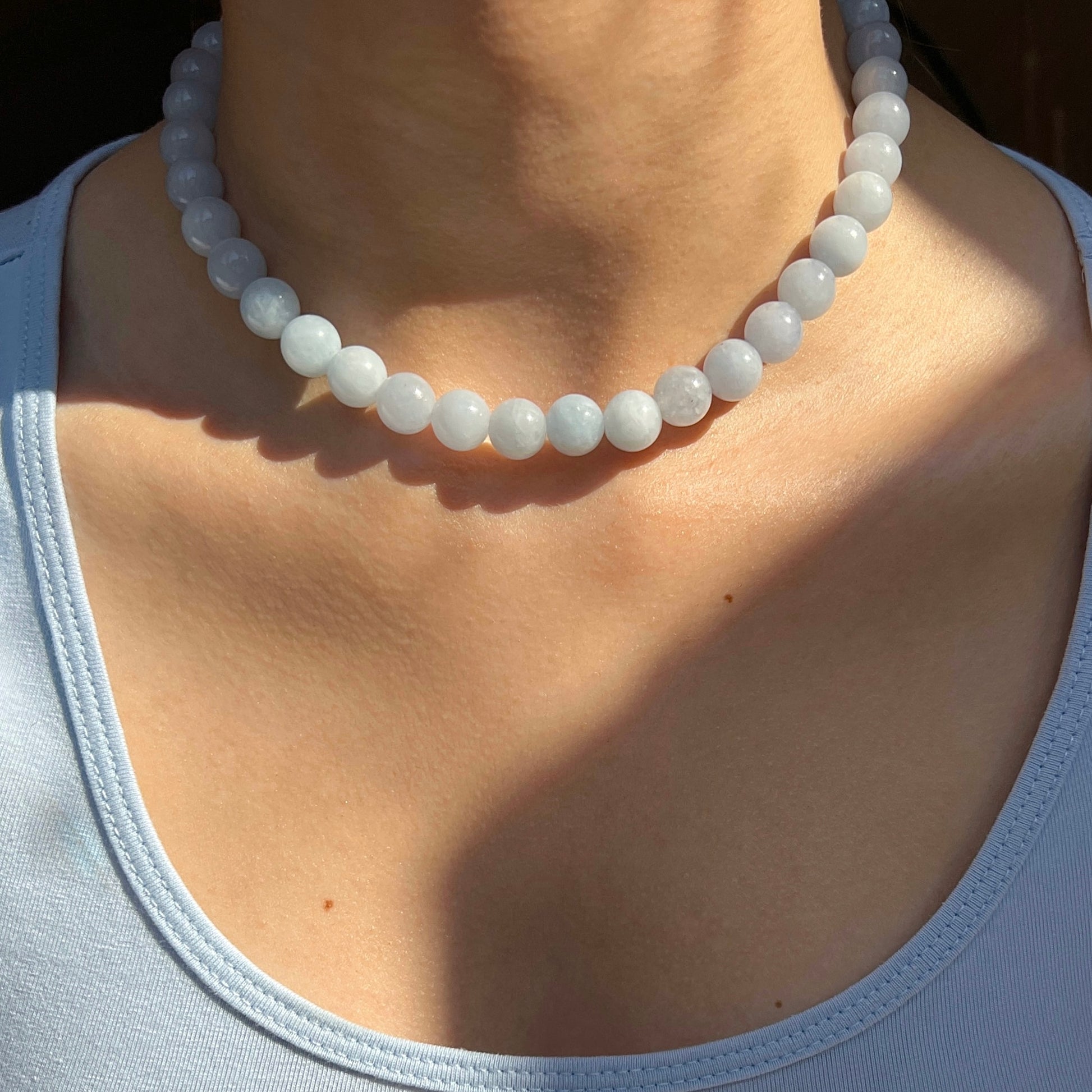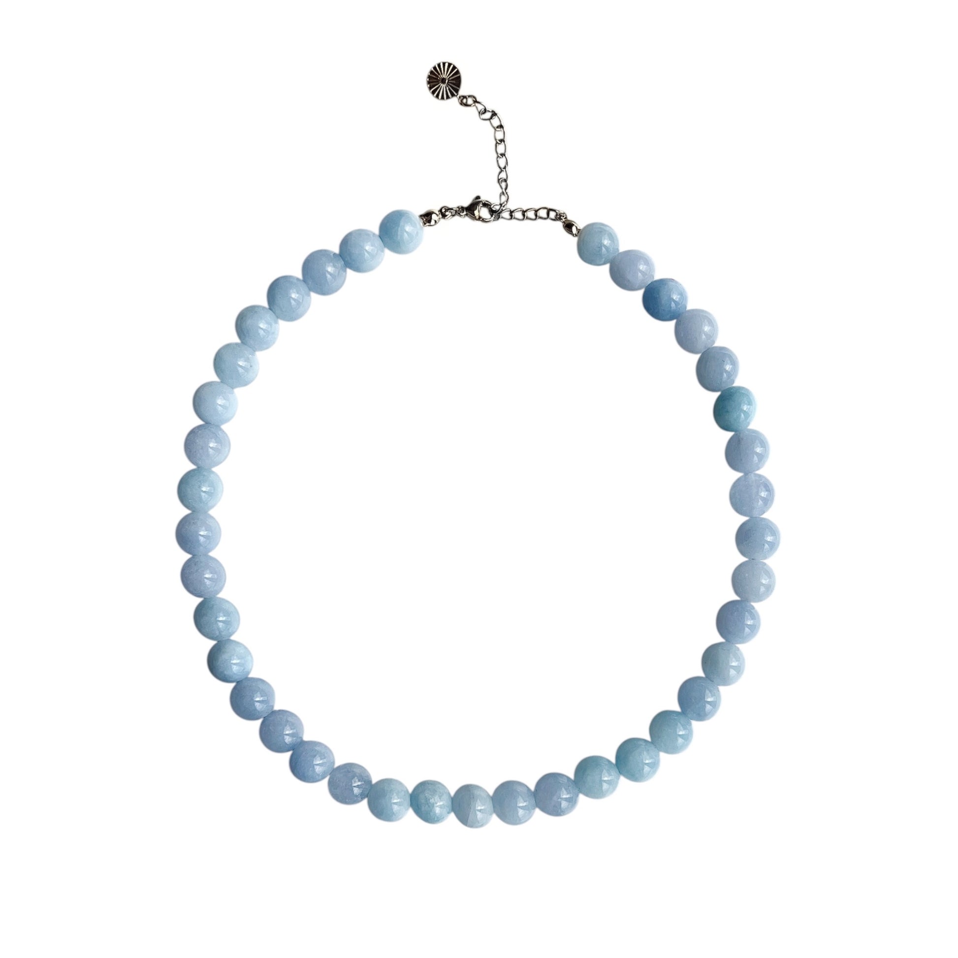 Smuk halskæde med 10 mm lyseblå jade perler.