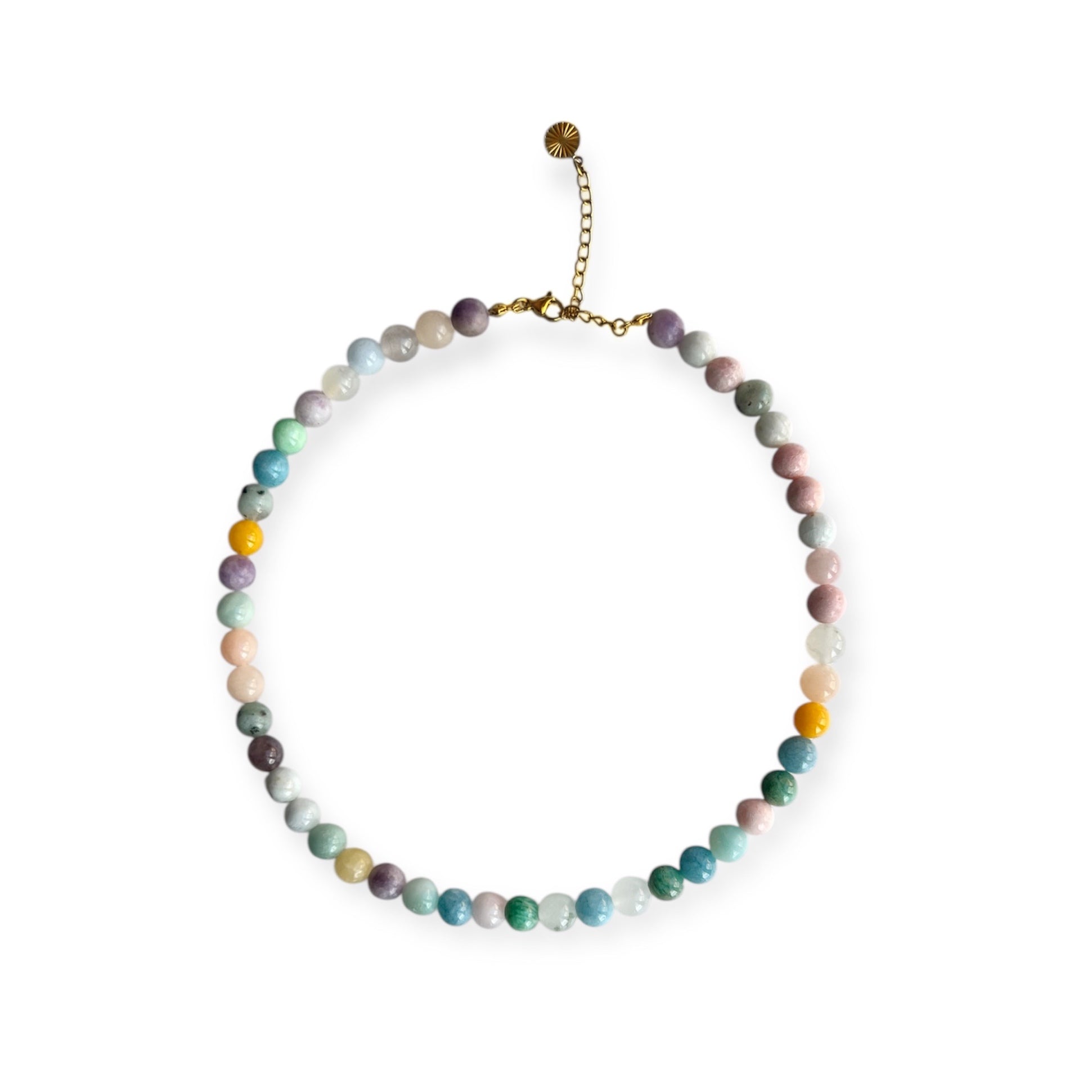 Smuk halskæde med naturlige stenperler i forskellige farver.
