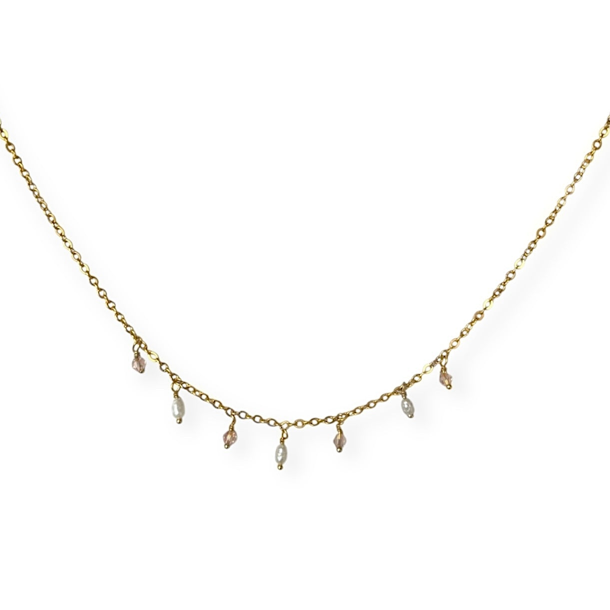 Den fineste halskæde med små rosa glasperler og ægte ferskvandsperler.