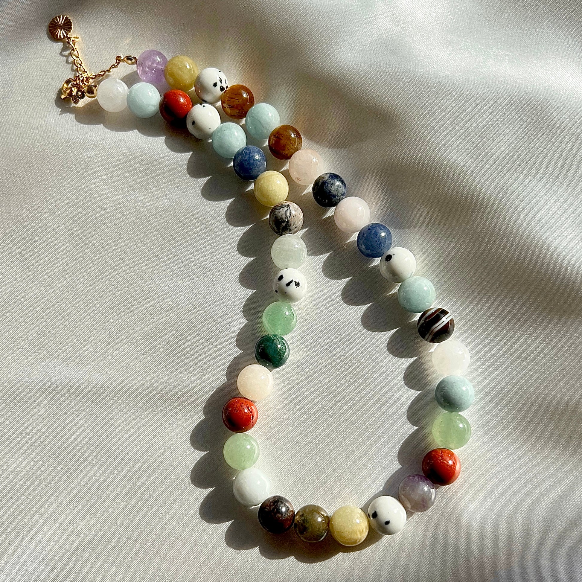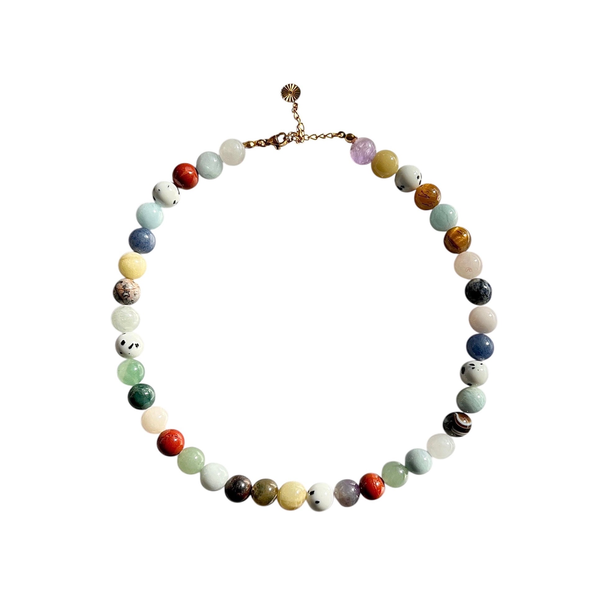 Halskæde med et farverigt mix af jade, quartz, aventurin, agat, jasper og andre smukke, naturlige stenperler.
