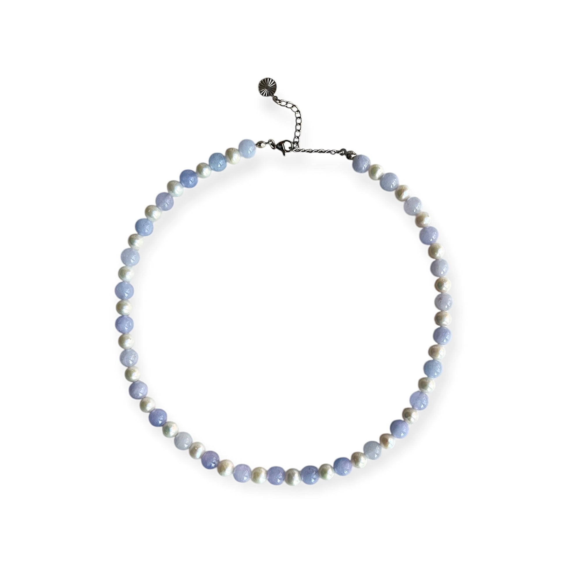 Smuk halskæde med ægte ferskvandsperler og 8mm blå jade perler.