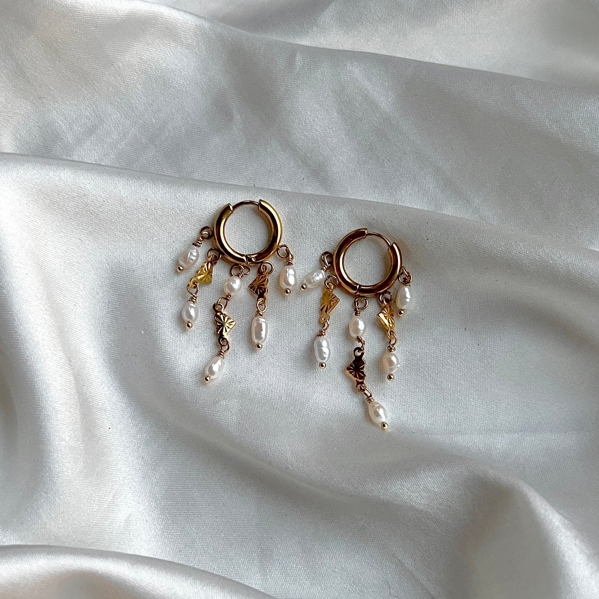 Smukke huggie øreringe med små ferskvandsperler og hjertevedhæng.