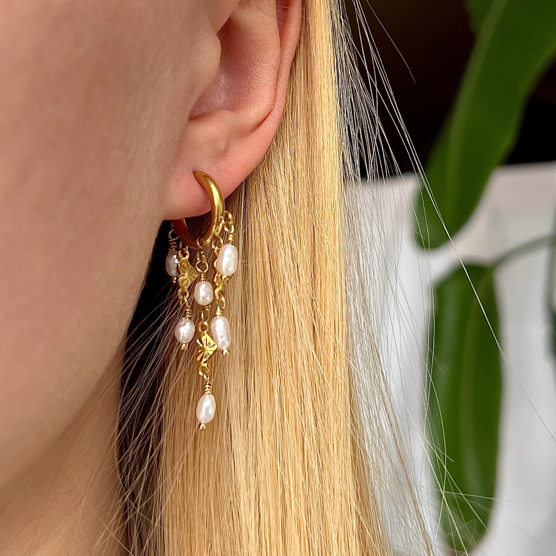 Huggie øreringe med ferskvandsperler og hjerter Guld