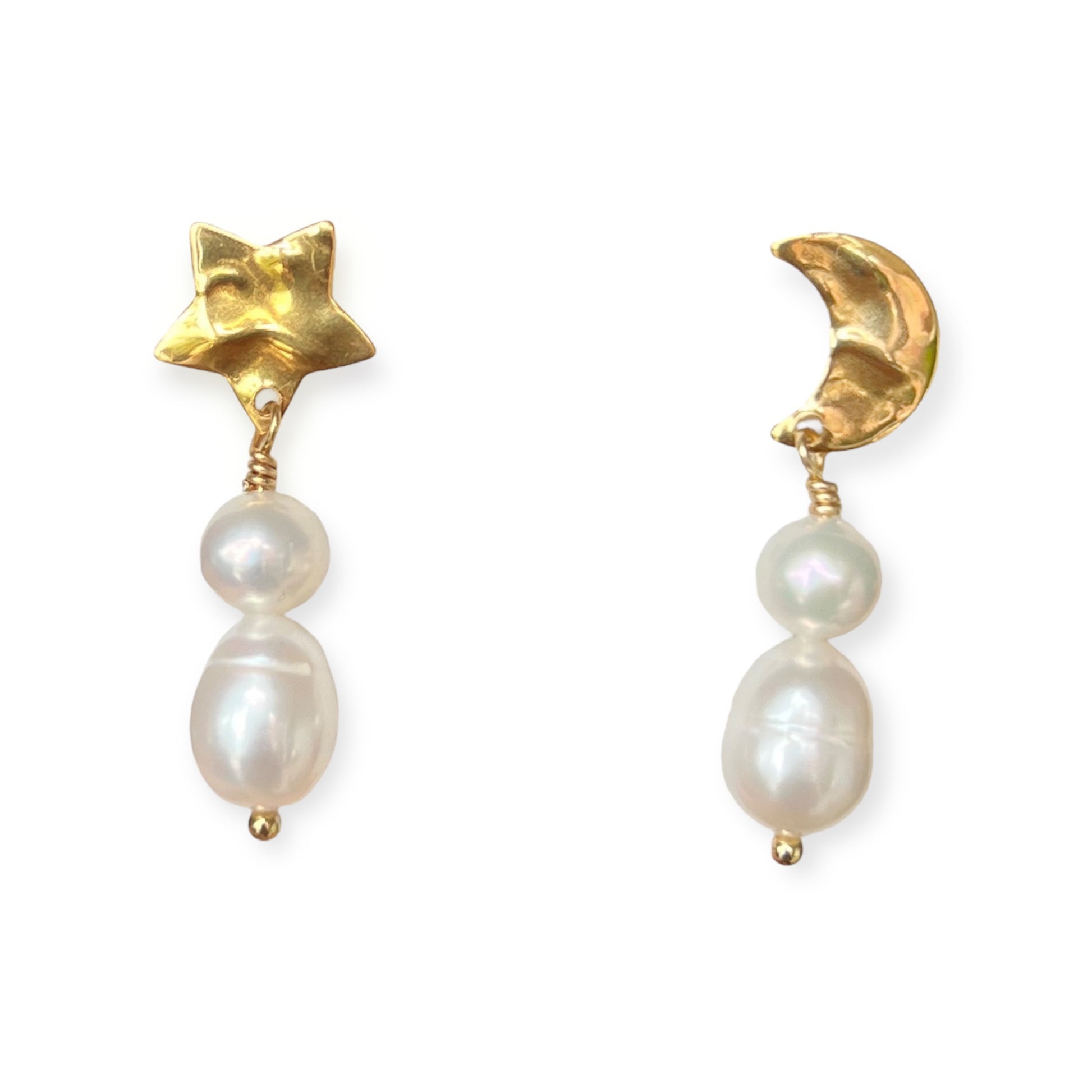 Smukke øreringe med måne, stjerne og ferskvandsperler.