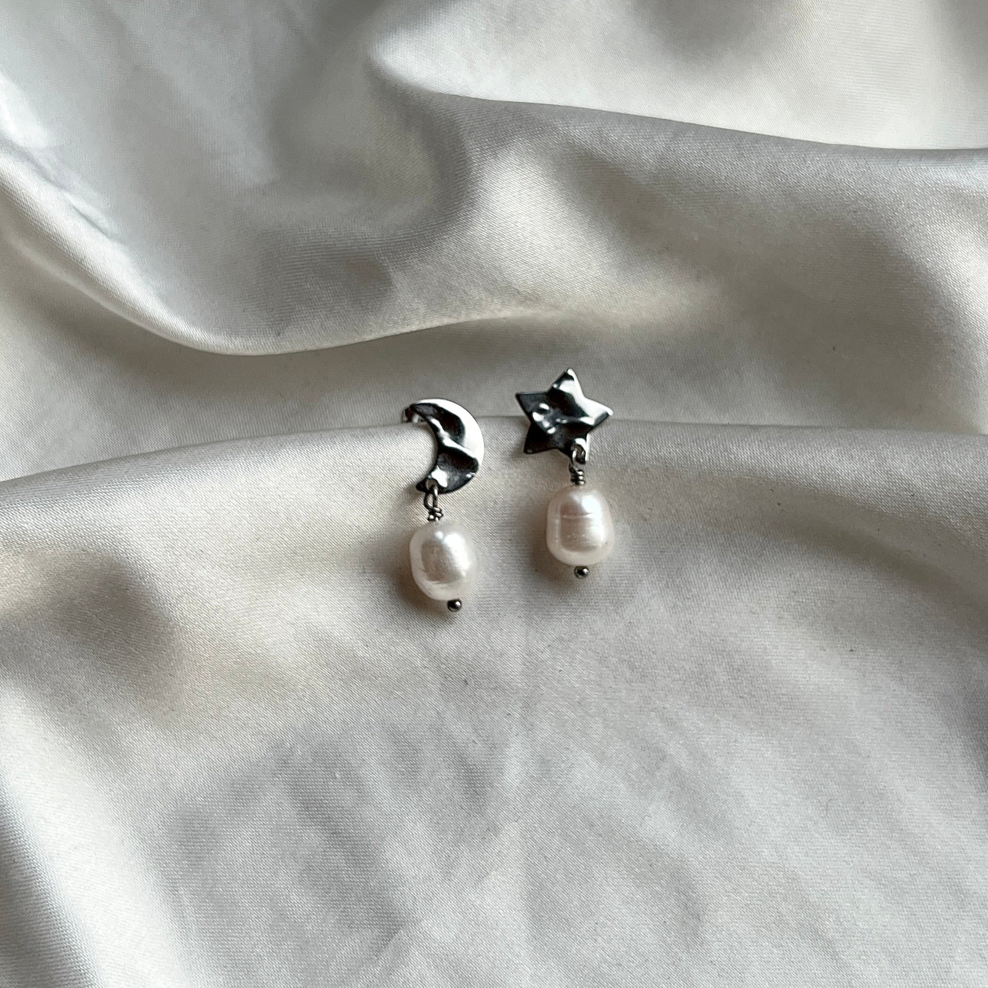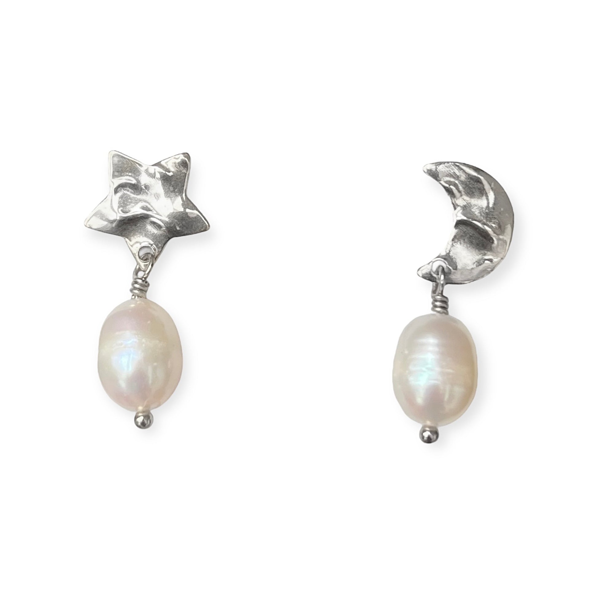 Smukke øreringe med måne, stjerne og ferskvandsperler.