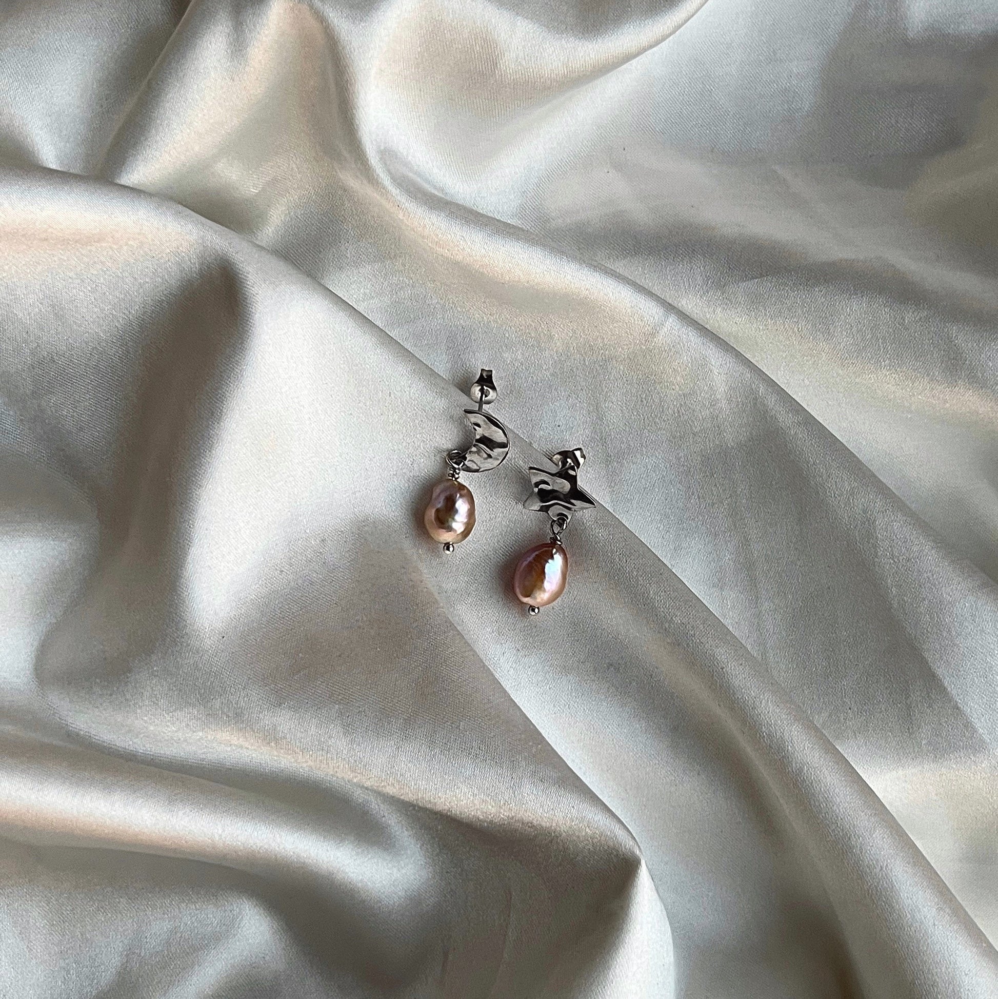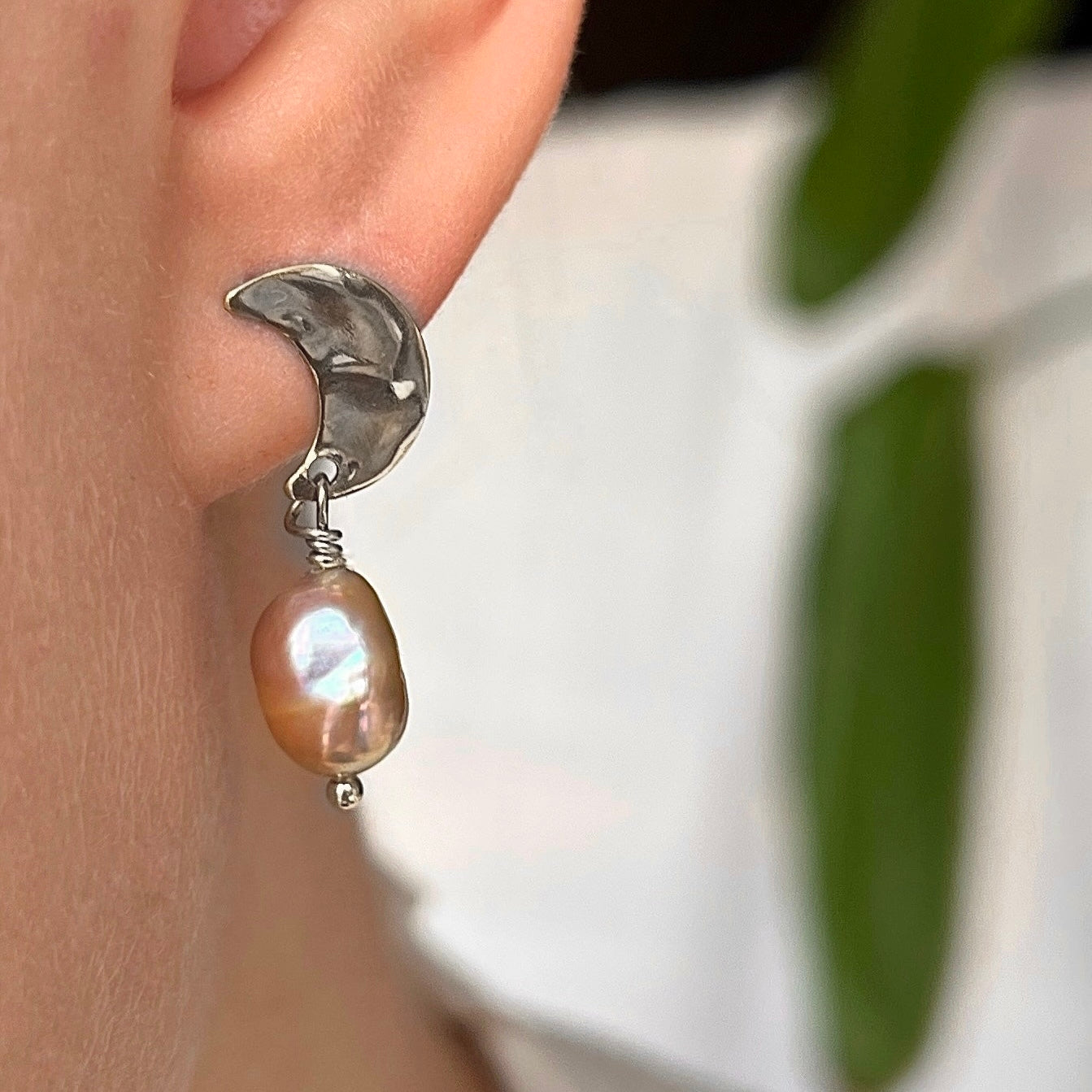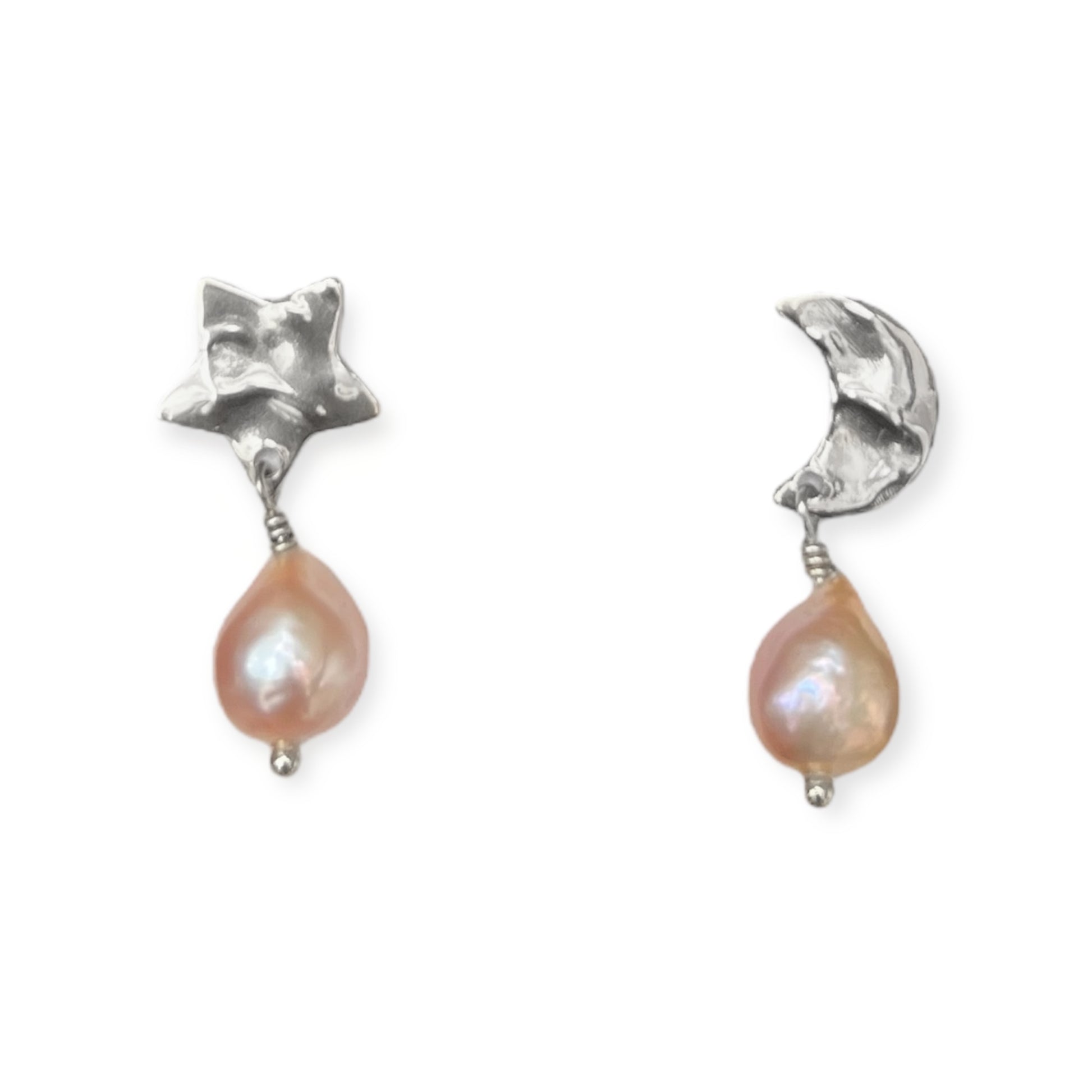 Smukke øreringe med måne, stjerne og ægte rosa ferskvandsperler.